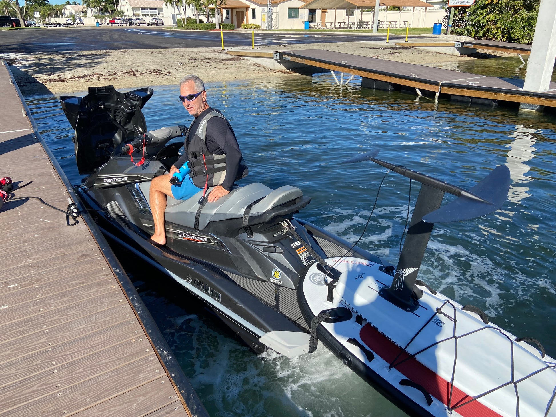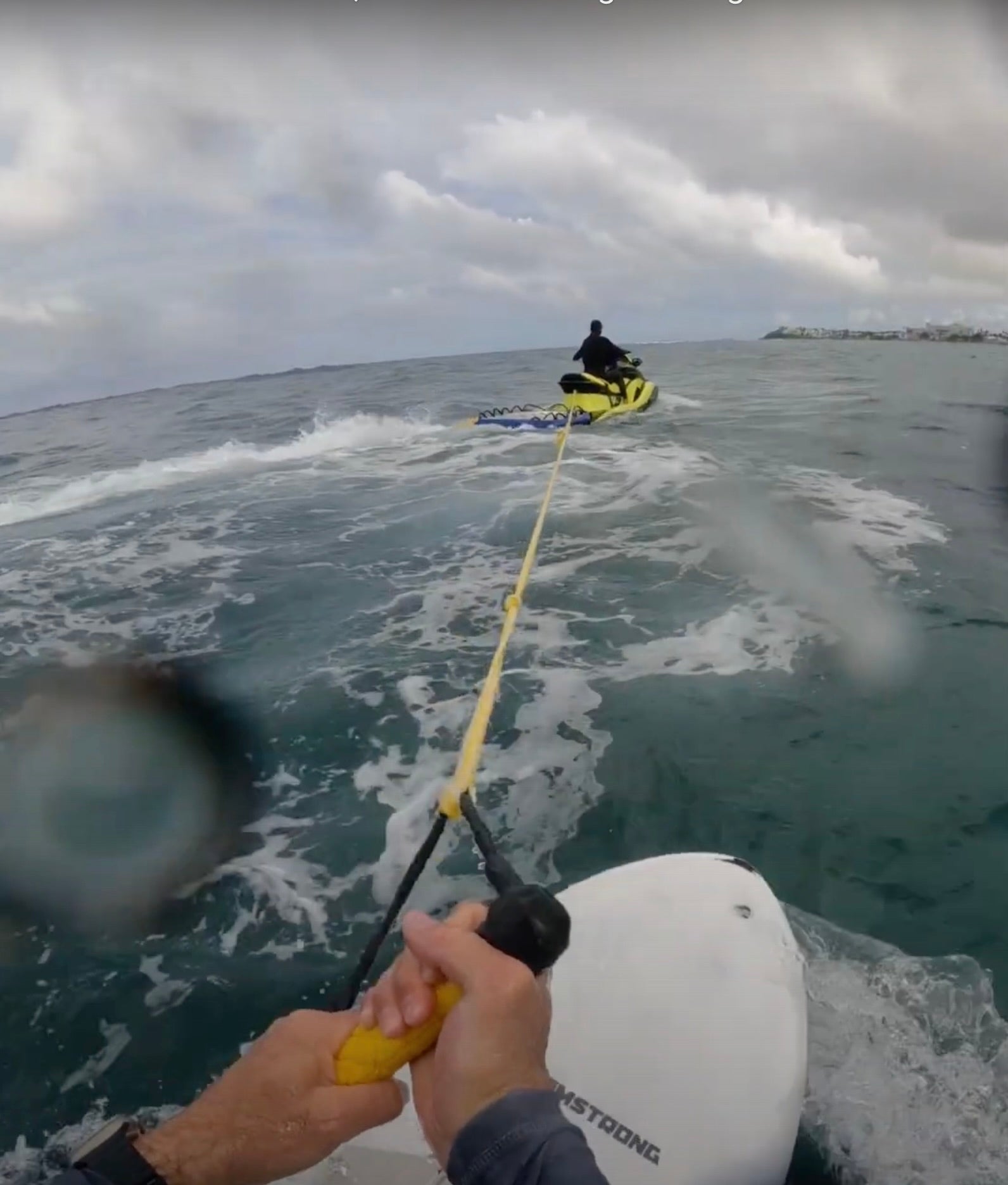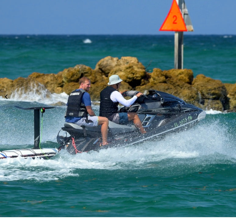 Focuses on tow foiling using a Jetski. Course is not swell dependent. Students practice getting up onto foil efficiently behind a jet ski and maintaining level flight.